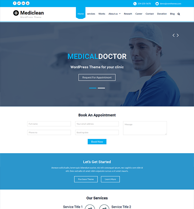 Mediclean  is a clean but aesthetic, simple but appealing WordPress Theme created for medical or health related websites. It has responsive layout with a beautiful slider and a wide range of elements/features specially created for medical related sites. It is maintained in minimal and modern style, bringing the well-defined content in the focus of the visitor’s attention. Attractive design, pleasant to the eye color scheme and great functionality make this theme perfectly suitable either for medical or business websites. Official Support Forum: http://themepalace.com/support-forum/ Full Demo: http://wenthemes.com/theme-demos/?demo=mediclean