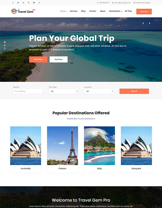 Travel Gem Pro is a trendy WordPress theme designed for travel and tours businesses. It smoothly integrates the travel plugin WP Travel so that you can display the travel packages in attractive way and allow users to book package easy. Thanks to the page builder integration, bringing changes to the layout is easy like drag and drop and code free. Theme is responsive and cross browser compatible which makes your site looks awesome in all devices of different sizes and also in several browsers. It is packed with useful features and user-friendly theme options.