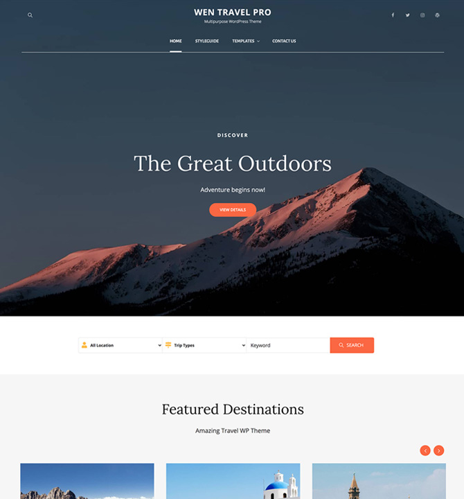 WEN Travel Pro is a versatile and responsive Multipurpose Travel WordPress theme with an abundance of travel features and functionalities. The theme is ideal for all travel-related businesses and blogs like Travel Agencies, Travel Blogs, Travel journal, and Tourism Websites. It comes with a simplistic layout and advanced functionalities to revive your travel site. The modern design is responsive and excellent to attract potential customers. A vast range of features has been power-packed into WEN Travel Pro, making it a perfect theme to suit all business kinds. Since it is a multipurpose WordPress theme, it includes a wide range of crucial features like Header Media, WP Travel Plugin Compatible, Gallery section with fluid design, Header Top Option, Portfolio section with Trips Destination Filter, Promotion Headline with Video option, Hero Content, Logo Slider, Stats, Team, Testimonials, and more. In order to get Trips Filter and sections like Latest Trip and Destinations, you need to activate the WP Travel WordPress Plugin. All of the sections and features in WEN Travel Pro are fully customizable and absolutely easy to use. So, if your goal is to create a successful Travel WordPress theme, WEN Travel Pro is the one to go for! Moreover, one-click demos are also available to minimize your time on website customization. Official Support Forum: https://themepalace.com/support-forum/ Full Demo: https://wenthemes.com/theme-demos/?demo=wen-travel-pro