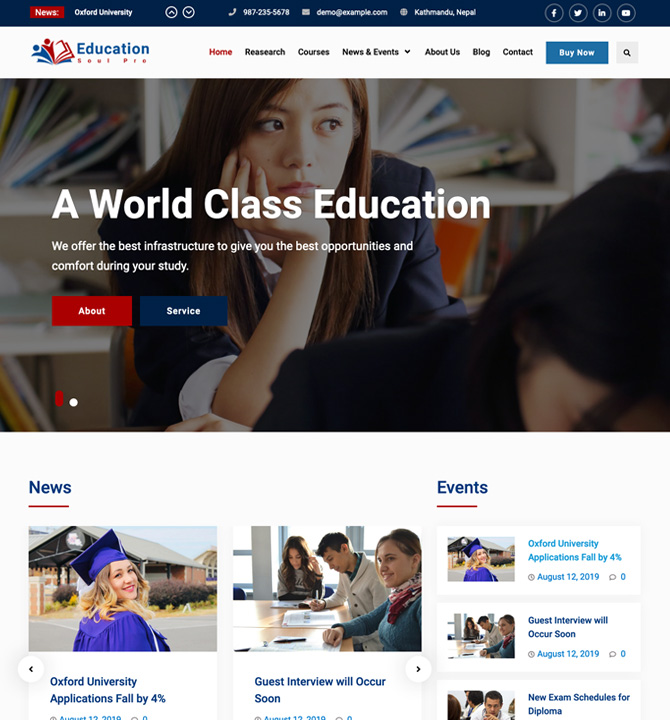 Education Soul Pro is a Simple and Clean Premium Education WordPress Theme with a pleasant feel. It is very easy to use for all types of educational institutions like colleges, universities, schools, and different other education-based websites. Although the theme is focused on educational purposes, it will be fit other business and corporate fields also. It is highly customizable with powerful Theme Options based on Customizer API. Several custom sections are available to give your home page an attractive look. It comes with several features to make a user-friendly, interactive and visually stunning website. The theme is responsive, cross-browser compatible and translation ready. Official Support Forum: https://themepalace.com/support-forum/ Full Demo: http://wenthemes.com/theme-demos/?demo=education-soul-pro