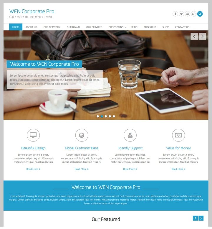 WEN Corporate Pro is a simple and clean business-based responsive WordPress theme. With standard sections that work for any Company, convenient Theme Options for easy management and standard features of an elegant blog and homepage, this is a fine solution for a fine presentation. The code / setup is easy to customize and extend by various hooks offered in the build. With generous spacing toward a clean presentation, standard coding practices, latest feature the theme could be a next for your awesome site. Official Support Forum: http://themepalace.com/support-forum/ Full Demo: http://demo.wenthemes.com/wen-corporate-pro/