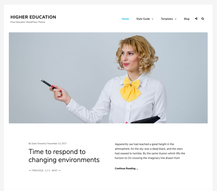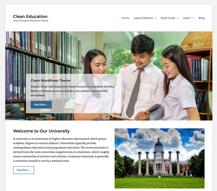 Higher Education is a perfect pick for those who want a clean, sleek design with basic customization features. It has been specially designed to fit Schools, Universities, and Academic Institutions. The responsive layout and beautiful design make your education site look warm and welcoming. Every section is easily accessible and your visitors will not get confused while exploring your site. It has a large roster of versatile features like header media, courses, professors, social icons, featured slider, hero content, and more. It is the ideal theme for all academic institutions. Your site will be engaging and informative with a Higher Education theme installed.