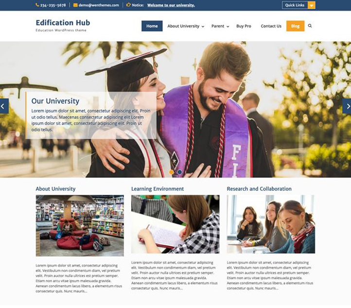 Edification Hub is the child theme of Education Hub. It is a responsive Education WordPress theme that is ideal for all educational sites. It includes the core features that were in its parent theme, Education Hub. For instance, Featured Slider, Custom Widget, Header Media, Custom Menu, Site Layout Options, and more. In case you want some unique feature on your site, you have the freedom to add your own Custom CSS. Edification Hub has a pixel perfect design and it helps you build your education site in just a few minutes. Not only for educational sites, but you can also use Edification Hub for different businesses, corporates, and Blogging websites. A minimalistic design with powerful customization options is what you get in Edification Hub. Try it today!