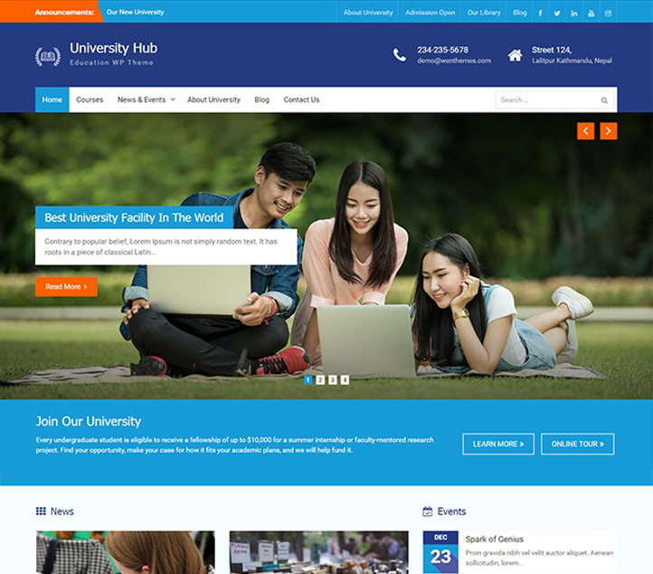 University Hub, an elegant and professional Education WordPress theme includes everything you need to build education sites. It is a responsive WordPress theme, ideal for universities, schools, colleges, and other educational institutions. University Hub comes with features like Custom Widgets, Featured Slider, Slider Options, Custom Menu, Menu Settings, Logo Customization, and more. All of these features are extremely flexible and you can use them to create any website you desire. University Hub is fully responsive and your site will look decent even on the smaller screens.